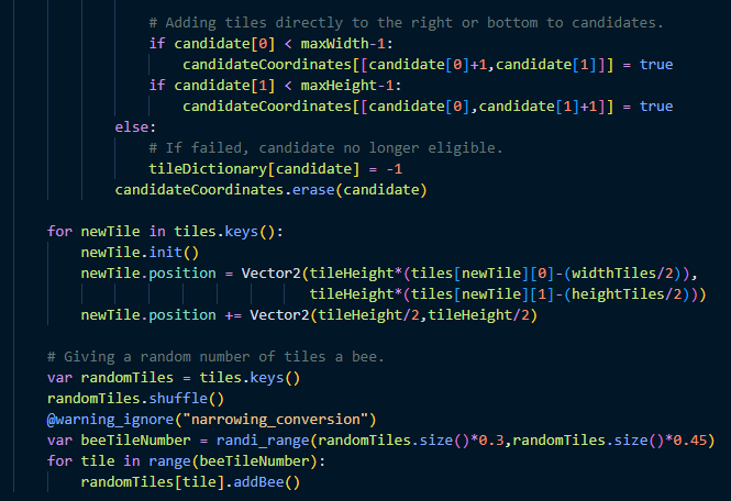I am kind of impressed I started using not just signals (what I would describe as receiver-agnostic information transfer tools), but custom signals such as game-start requests in my very first Godot project. There’s also some code for randomly determining a tile pattern and dynamically loading a texture for it, that’s pretty neat.