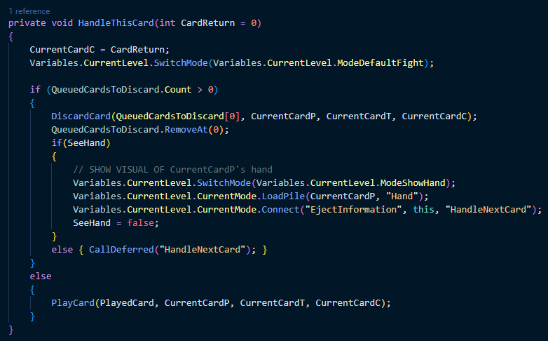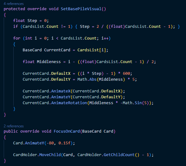 The game at its core uses only four main elements from which most elements are inherited: Card, Pile, Player, and Interface (UI element for displaying the content of piles as cards). This allowed for a relatively straightforward and predictable way for items to interact with each other while developing the features. Card effects are also queued as most of the time, multiple actions happen one after the other, most of which requiring player interaction.
