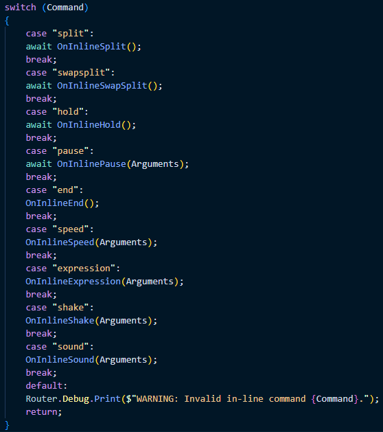 Dialogue text can include a range of custom commands such as pausing, speeding up, waiting for player input, playing a sound effect, triggering an animation for either of the speakers, shaking the screen, and others. Implementing new commands is quick and easy.