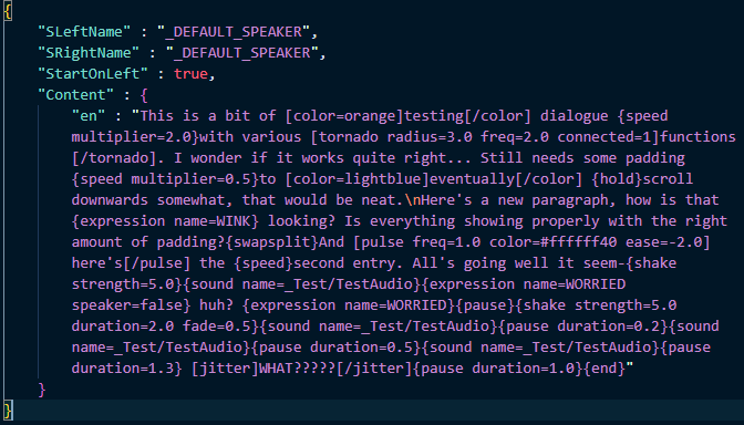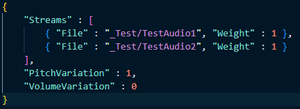 Sound effects are also loaded from their own JSON files which can contain multiple different streams from which a sound is played at random, as well as random pitch and volume data. All audio from dialogues is loaded beforehand to prevent unnecessary repeated JSON parsing of the same file within the same dialogue, and certain sound effects such as text advance are not freed upon finishing and instead kept instantiated and repeatedly triggered throughout the dialogue.