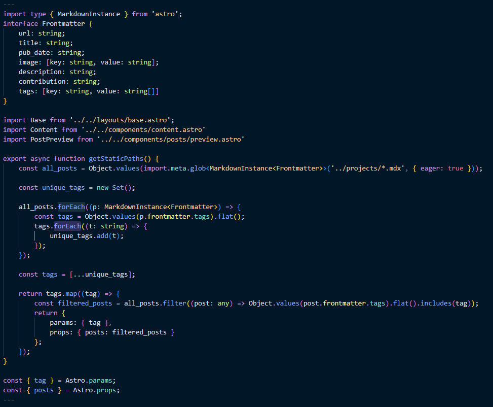I used Astro to build the site and wrote the whole website from scratch without a template. There’s a decent amount of TypeScript scattered in places, such as creating dynamic tag pages: