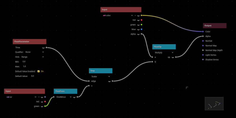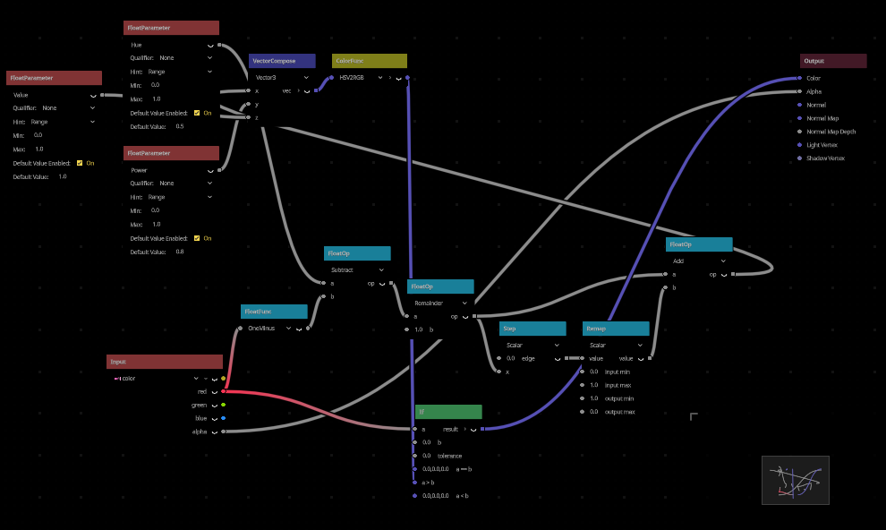And a few shaders on top. In order, a shader that coloured elements roughly based on the input colour (within an intentional interval), a shader that turned the object transparent bottom-to-top based on the control value (used for the exclamation points), and a quick shader to display the hue spectrum (used as background for the hue selection slider).