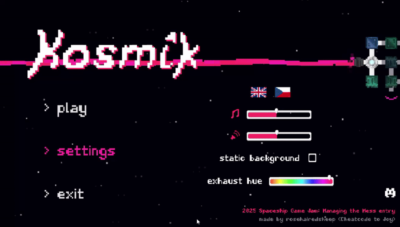 I created a pretty main menu with an animation for the settings popping up. Since I was controlling the exhaust hue via shaders, I had to create my own custom slider fill nodes, as the native Godot ones did not have support for user-assigned materials. I also created a second custom slider background for the hue selector, to which I applied a different shader.